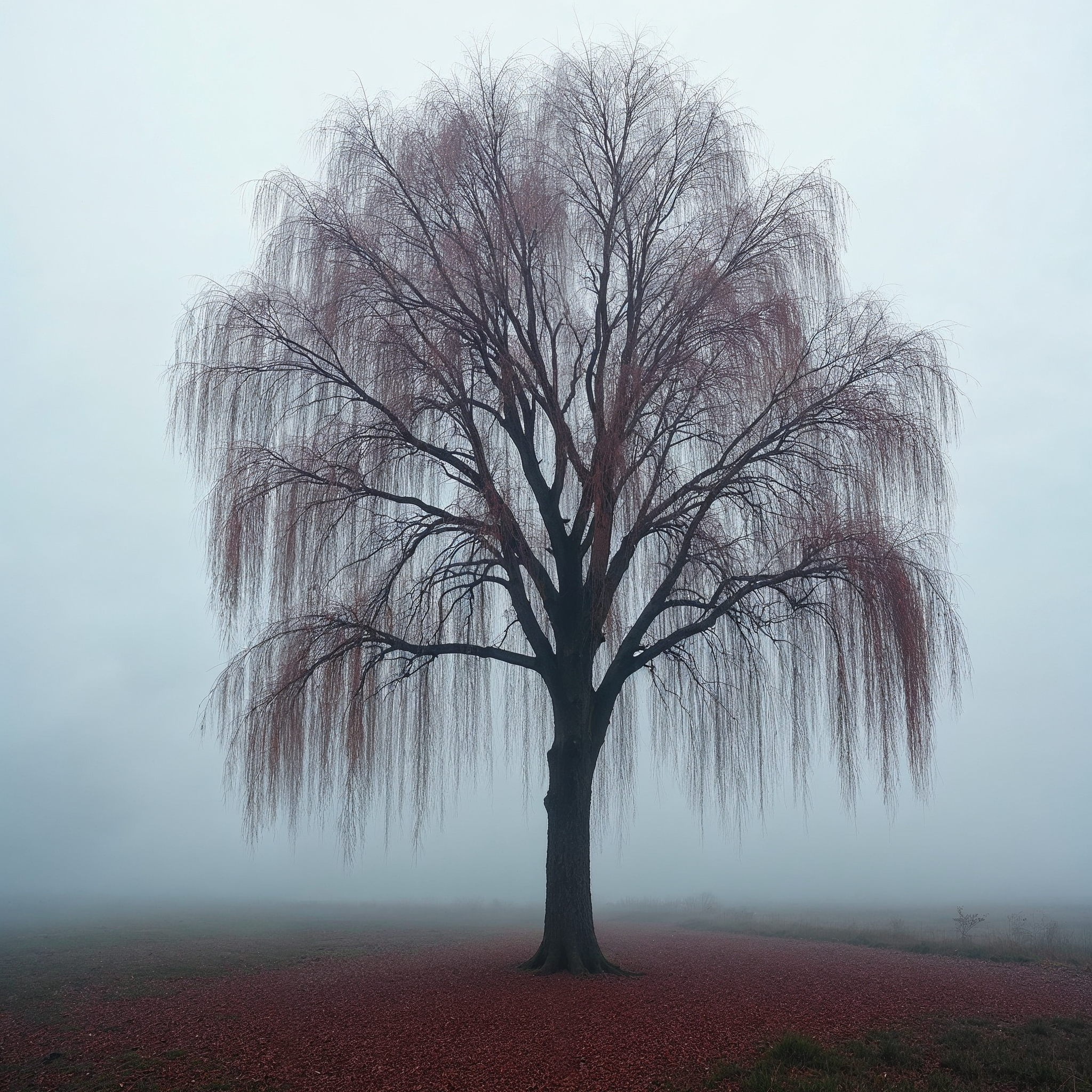 A tall weeping willow tree with long, drooping branches stands alone in a foggy field. The tree's foliage appears reddish-brown against the misty gray background. Red fallen leaves cover the ground beneath the tree.
