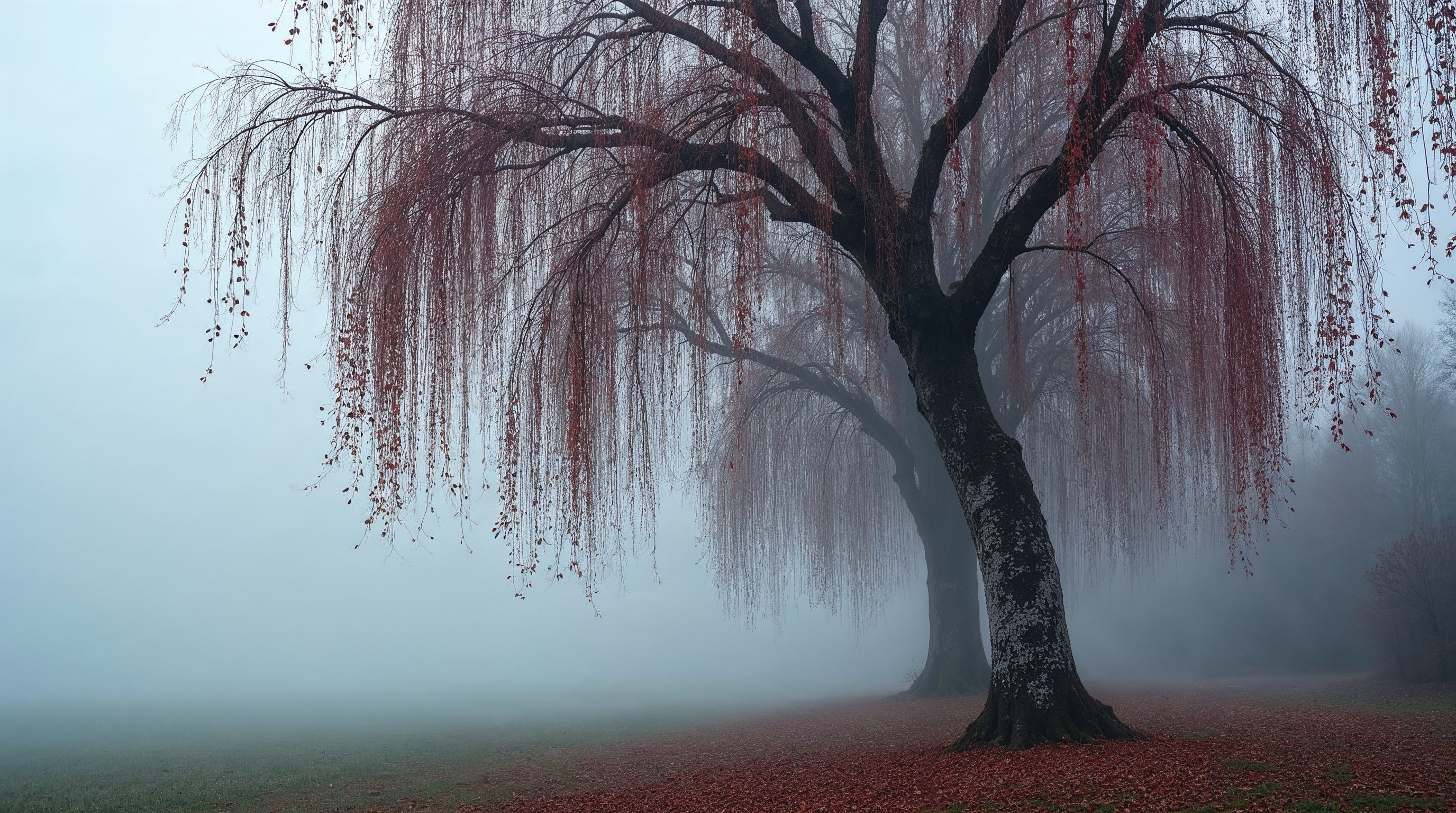 A tall weeping willow tree with long red branches stands in a foggy field. The trunk is dark and textured, with branches draping heavily in the mist. Red leaves and grass cover the ground beneath the tree.