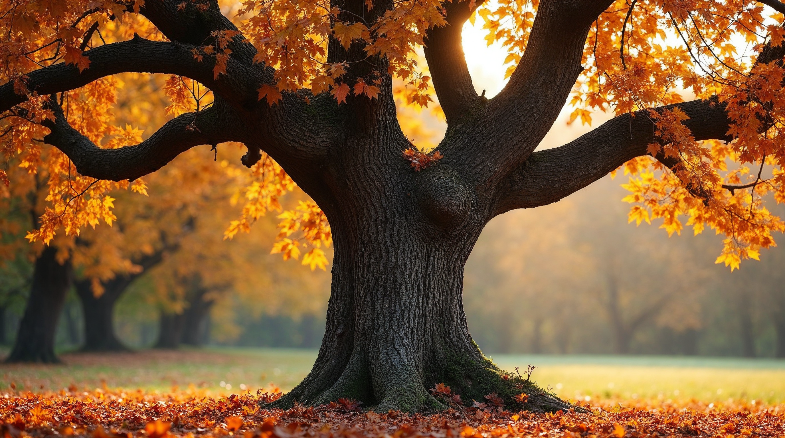 autumn, autumn landscape, bark, branches, fall foliage, forest, golden hour, grass, grove, leaves on ground, majestic tree, nature, orange leaves, park, seasonal, sunlight, tree trunk, vibrant colors, woods, yellow leaves, oak tree