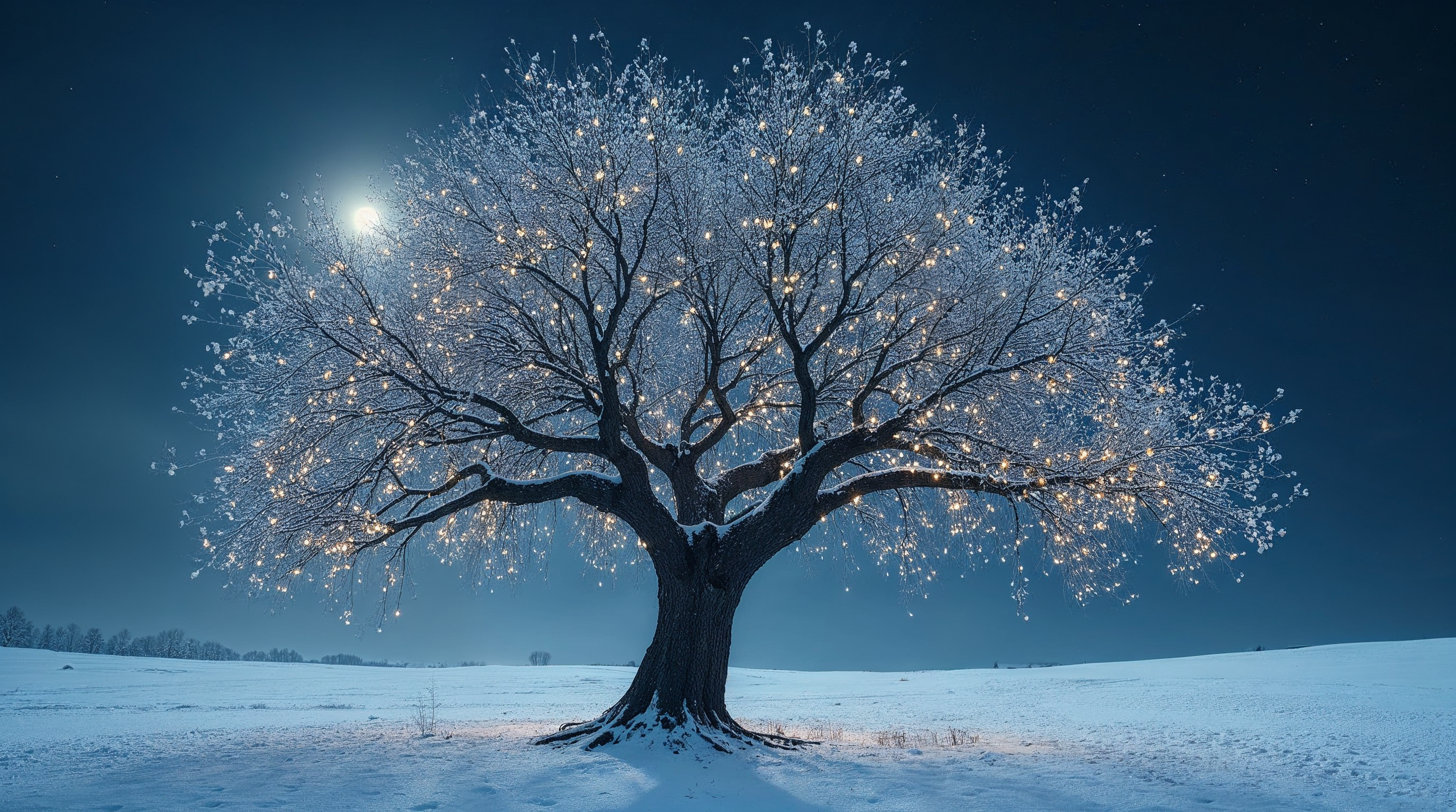 A large tree covered in snow and twinkling lights stands in a snowy field at night. A bright full moon illuminates the scene from the dark blue sky. The tree's branches are frosted white, glowing softly against the winter landscape.