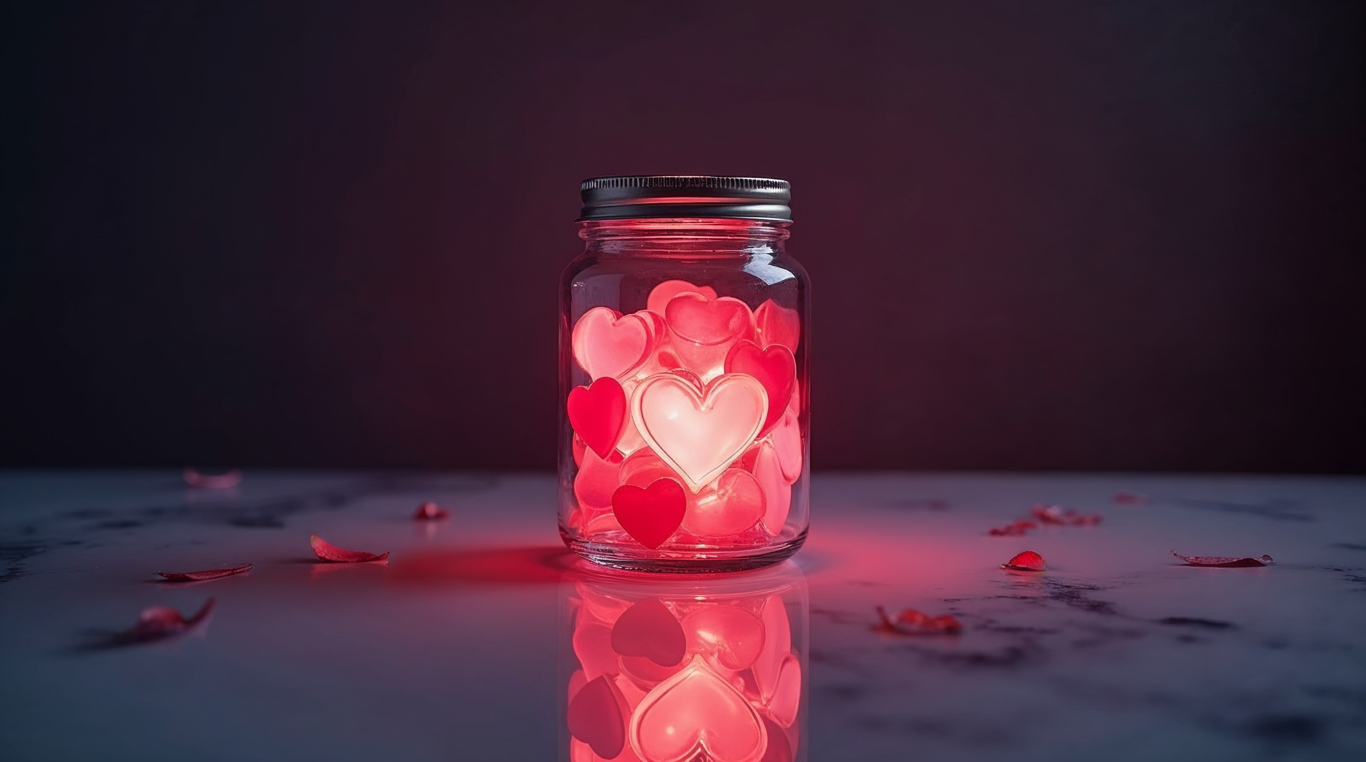 3D render, Valentine's Day, digital art, glass jar, glowing hearts, heart container, heart petals, hearts in jar, isolated background, light effect, love symbol, luminous hearts, marble surface, pink glow, red hearts, reflection, romantic, jar
