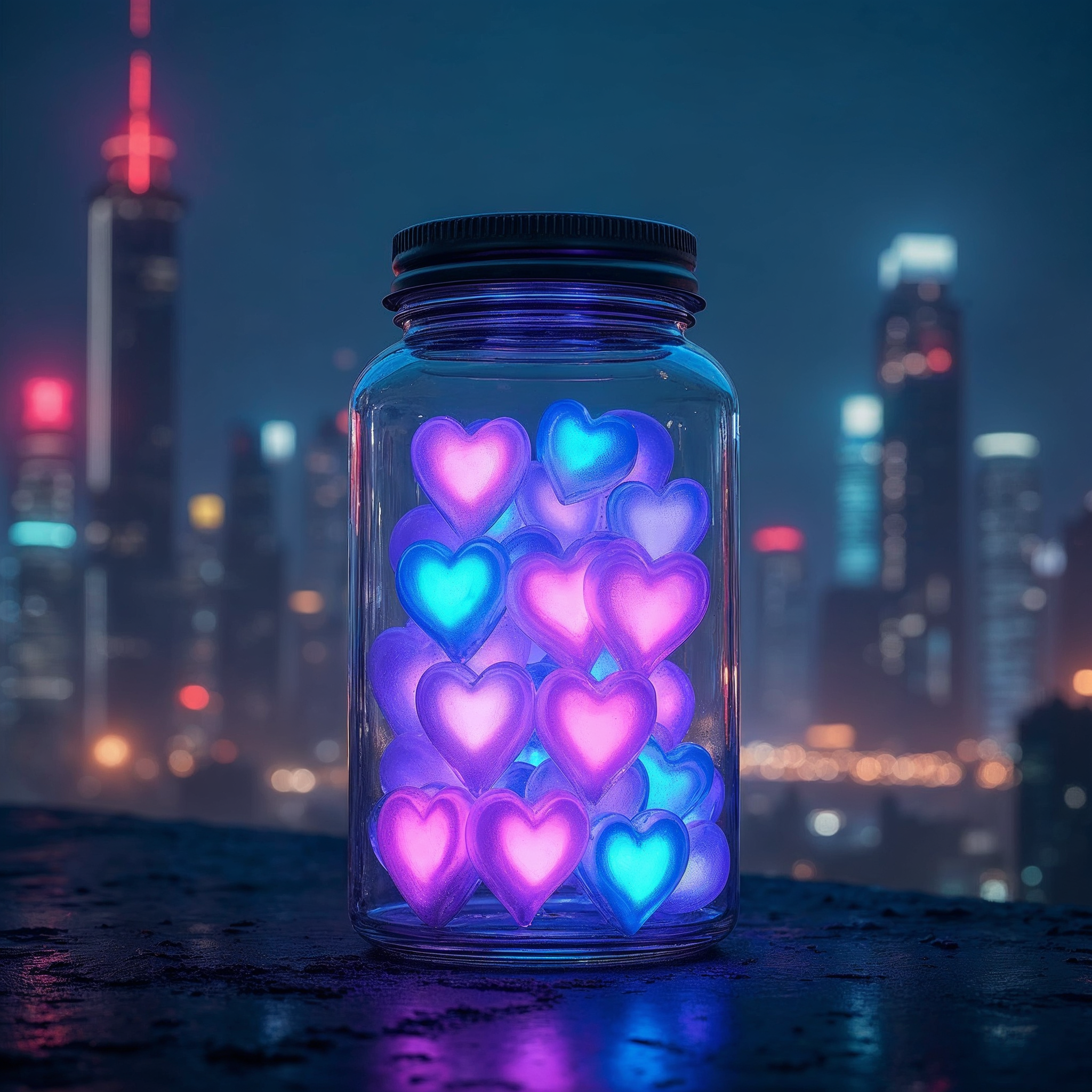 Glowing Hearts Jar on Night City Rooftop