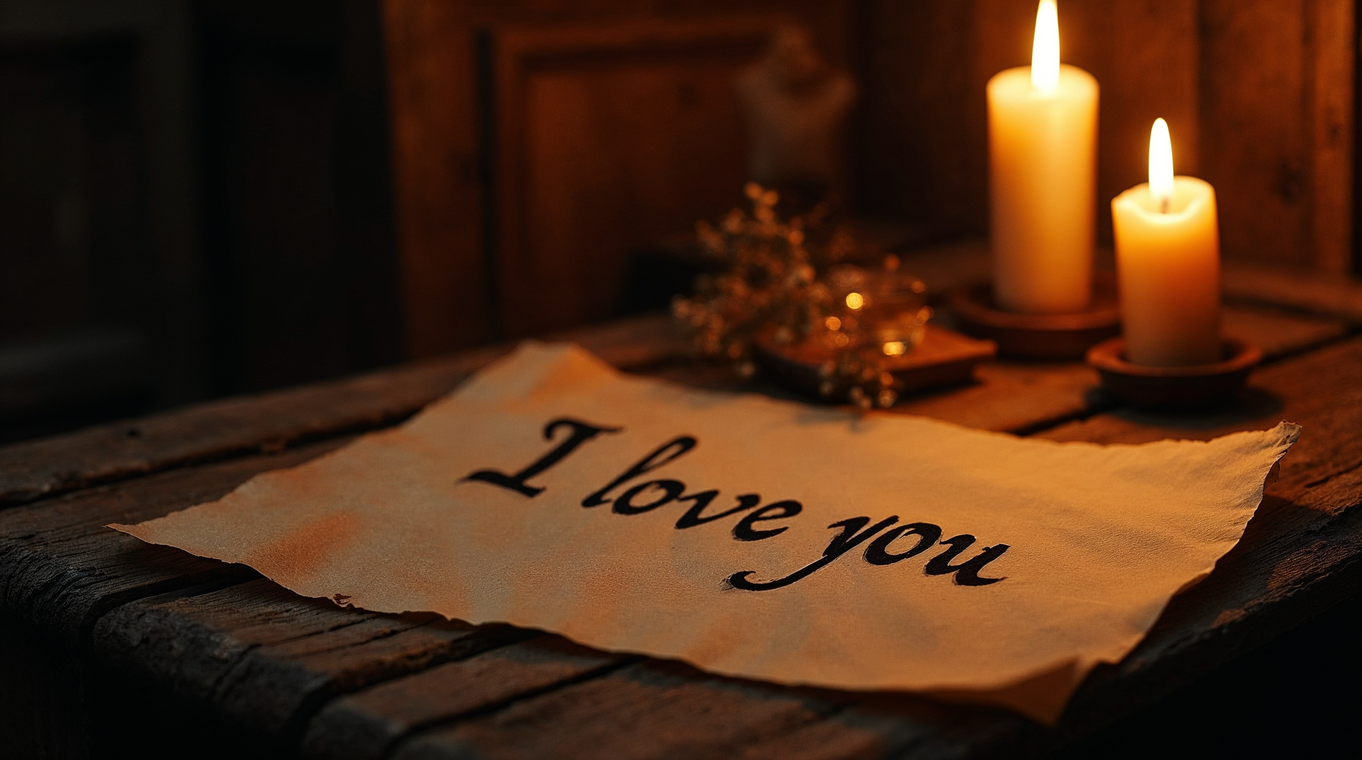 affection, beige paper, candlelight, candles, dark background, elegant script, flickering candles, gold ornaments, heartwarming, holiday decor, intimate scene, lit candles, love message, love note, paper note, romantic, romantic setup, rustic table, valentine, vintage paper, warm glow, wooden surface, wooden table, I love you
