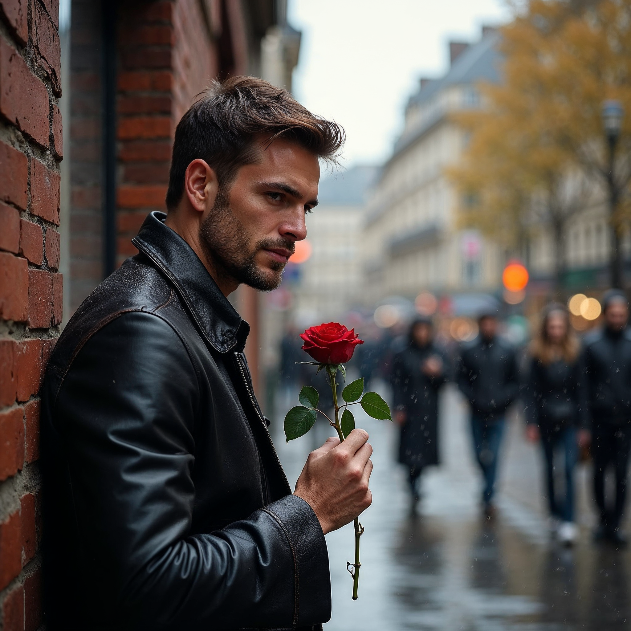 Paris street, White, autumn leaves, beard, black jacket, blurred background, brick wall, city street, fall foliage, handsome man, holding flower, leather jacket, male, pedestrians, rain, rainy street, red rose, short hair, single rose, stubble, thoughtful expression, urban scene, wet pavement, man