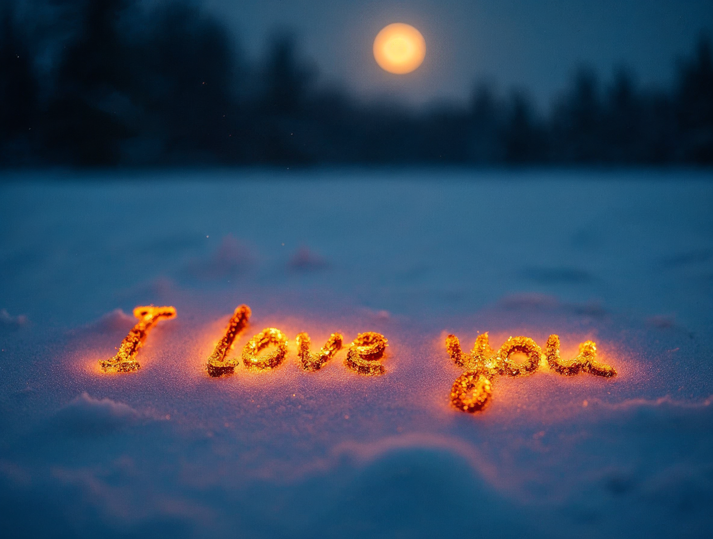 dark blue sky, fiery letters, forest background, full moon, glowing text, love message, moonlight, night sky, orange flames, pine trees, romantic, snow, snowflakes, snowy ground, valentine, winter, I love you