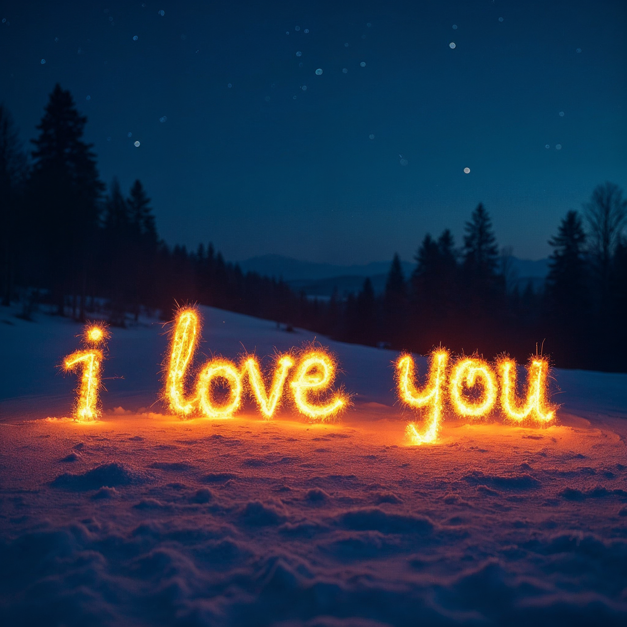 fire writing, glowing sparks, isolated background, love message, mountains, night sky, orange flames, pine trees, romantic display, snow ground, snowy scene, stars, winter landscape, I love you