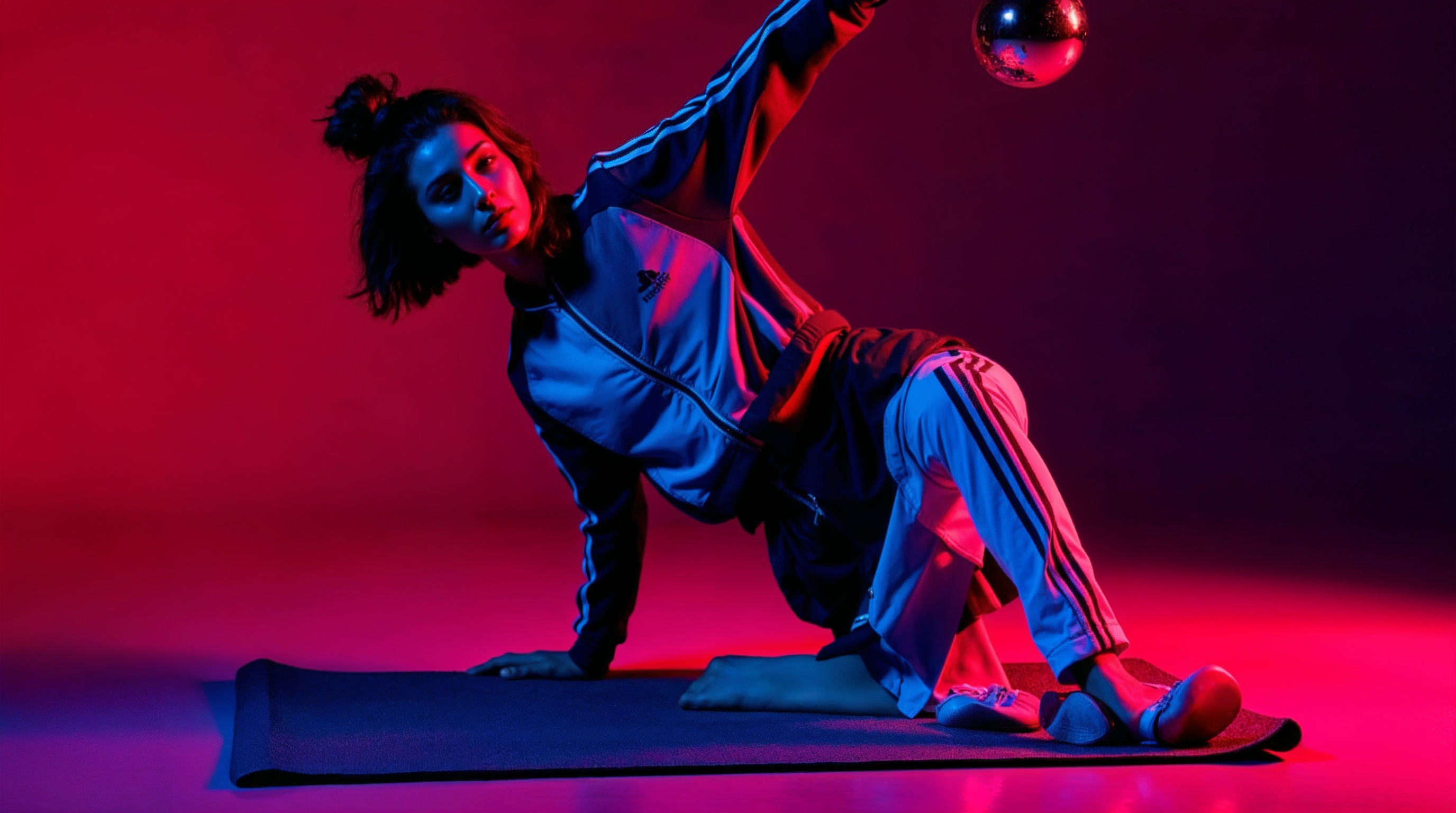 An Asian woman with short hair in a bun performs a yoga pose on a blue mat, balancing a large metallic ball above her head. She wears a black Adidas tracksuit with white stripes and neon pink shoes. The scene is illuminated with vibrant pink and purple neon lighting on an isolated background.