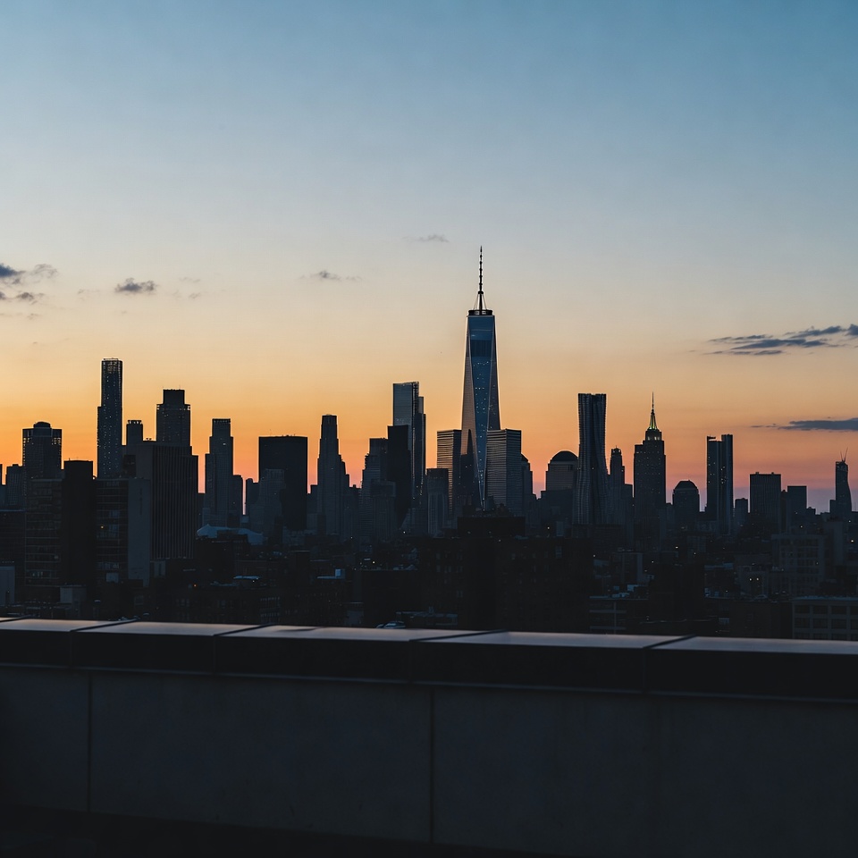 A stunning silhouette of the New York City skyline features the prominent One World Trade Center tower during sunset. The image captures tall skyscrapers against a gradient sky transitioning from deep blue to warm orange hues. A rooftop railing frames the foreground view.