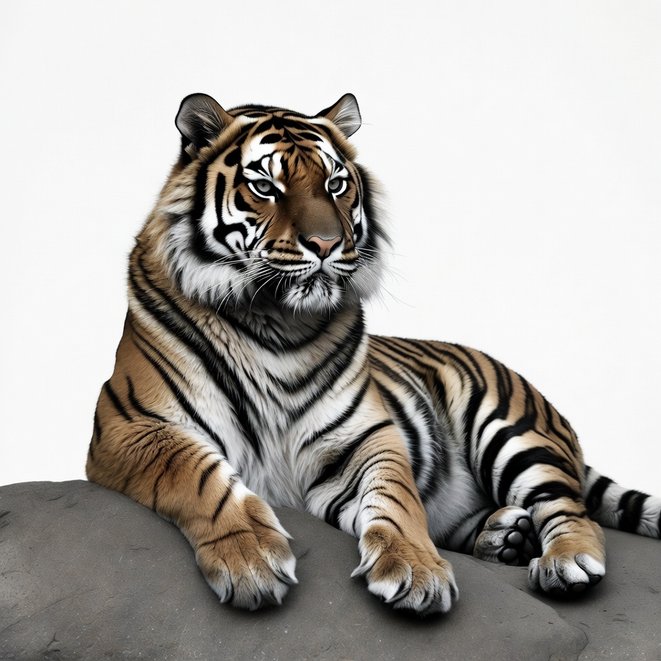 animal portrait, big cat, fierce, green eyes, isolated background, lounging, majestic, mammal, orange fur, paws, powerful, predator, rock, sitting tiger, stripes, whiskers, white background, wild animal, tiger