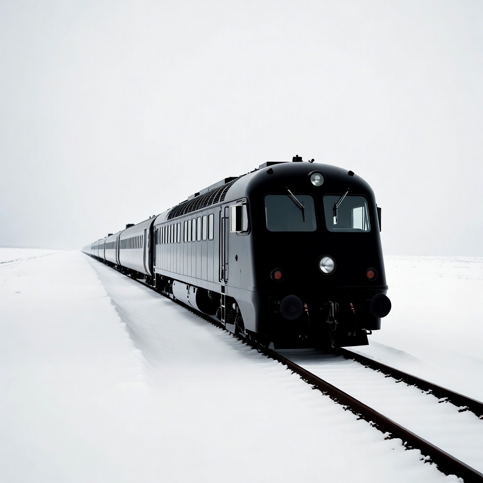 A sleek black passenger train travels along railway tracks covered in deep snow. The train features multiple cars with a rounded front locomotive and windows on the sides. The scene is set against a vast, foggy white landscape with no people visible.