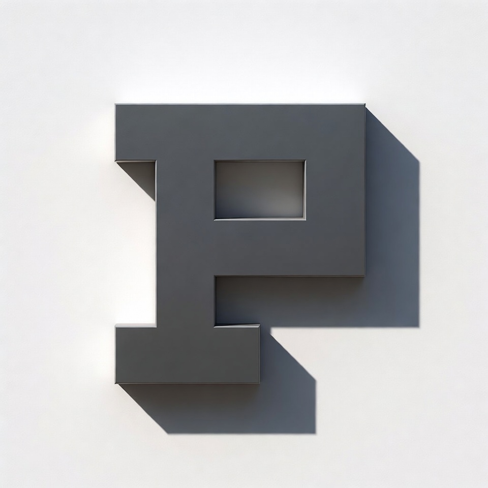 A three-dimensional gray letter P is rendered with a modern blocky font on a white background. It features sharp edges, a hollow center, and realistic shadows beneath it for depth.