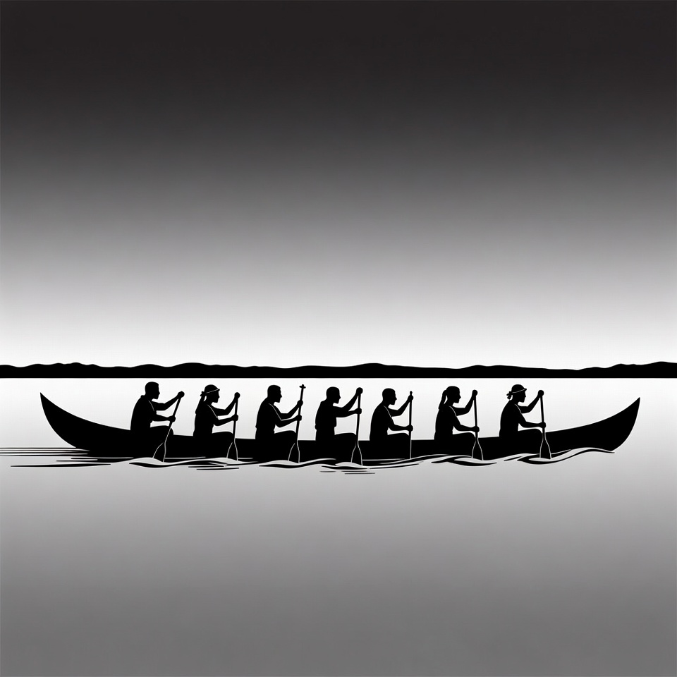A black silhouette illustration depicts six people paddling a long canoe across a calm body of water. They hold paddles and lean forward in unison, with distant silhouetted hills on the horizon. The scene is set against a gradient dark sky and water background.