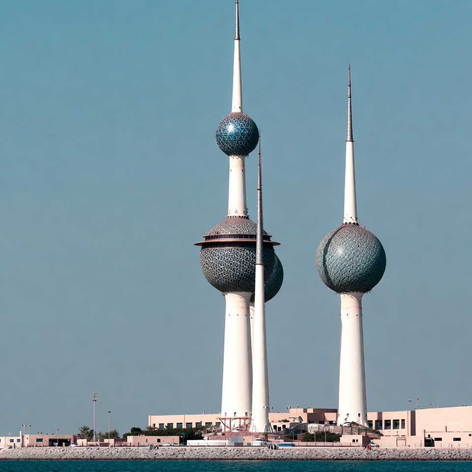 Kuwait City, Middle East, Persian Gulf, architecture, blue orbs, blue sky, buildings, cityscape, horizon, iconic, landmark, modern building, ocean, sea, skyline, spheres, structures, tourism, towers, travel, waterfront, white spires, Kuwait Towers