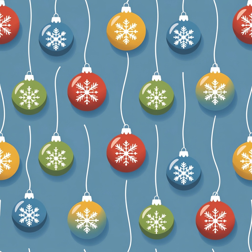 A seamless pattern features colorful Christmas baubles hanging from white strings on a blue background. The ornaments include red, green, blue, yellow, and gradient balls adorned with white snowflake designs. They are arranged in a repeating grid layout.