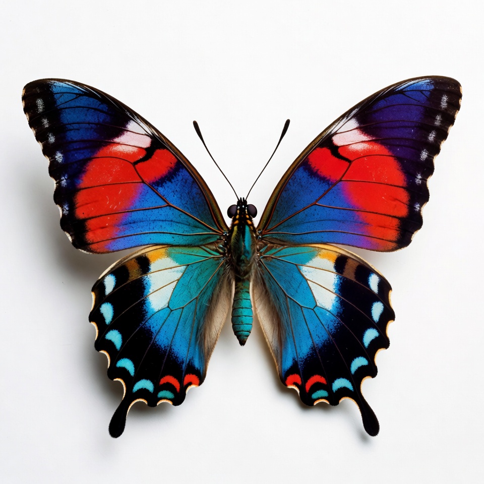 Morpho butterfly, blue wings, butterfly wings, colorful butterfly, insect, iridescent, isolated background, nature, purple wings, red wings, tropical butterfly, vibrant colors, wildlife, wings spread, butterfly