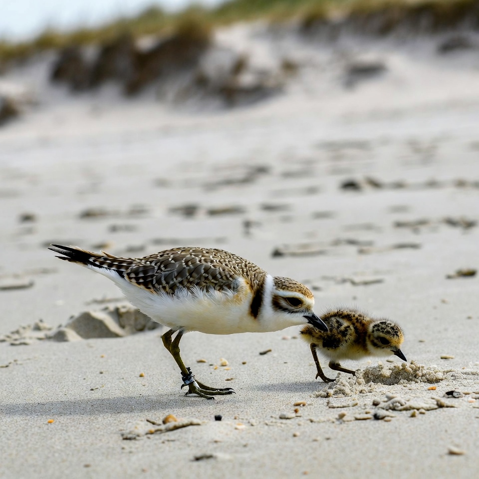 Piping Plover Feeding Chicks on Beach