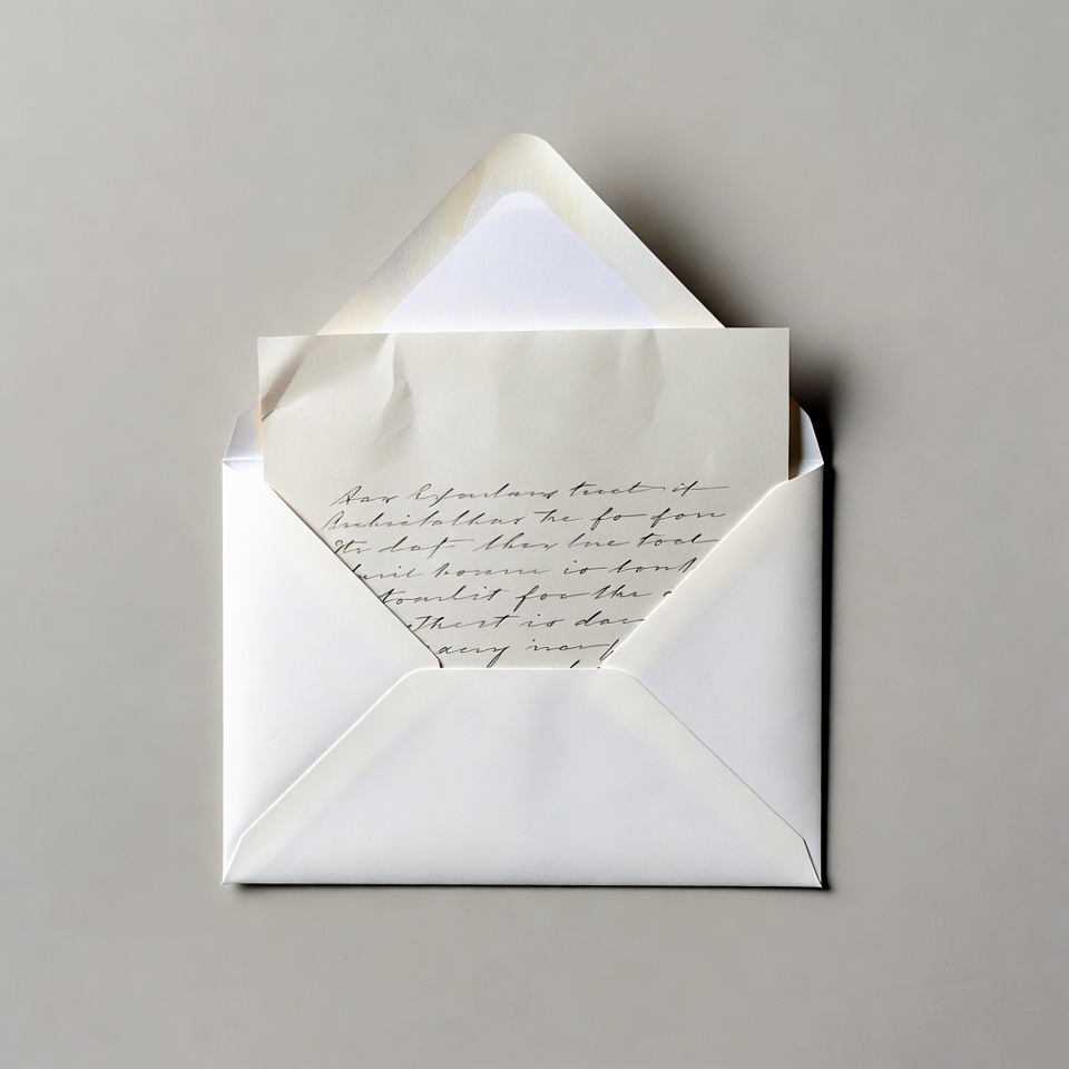 A white envelope is partially open on a light gray background, revealing a folded sheet of white paper with handwritten cursive text. The envelope flap is lifted, displaying elegant script writing on the visible portions of the letter. The composition is clean and isolated against the neutral backdrop.