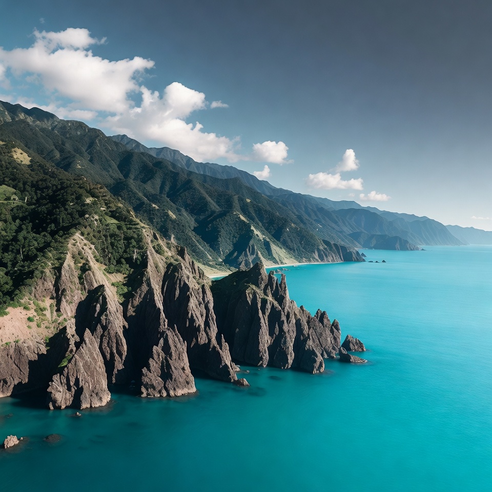aerial view, blue water, cloudy sky, coastal mountains, coastline, green vegetation, mountain range, mountains, nature landscape, ocean, rock formations, rocky coast, rugged cliffs, scenic view, sea cliffs, snowy peaks, steep cliffs, turquoise sea, vibrant ocean, cliffs