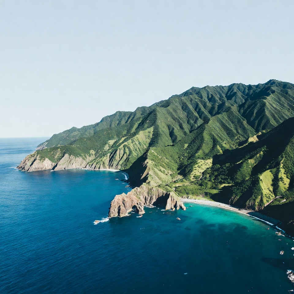 beach cove, blue water, clear sky, cliffs, coastal landscape, drone photo, forest, geography, green hills, green mountains, lush hills, mountain range, nature, ocean waves, panorama, ridges, rocky shore, sandy beach, scenery, sea, travel destination, tropical coast, turquoise ocean, vegetation, wilderness, aerial view