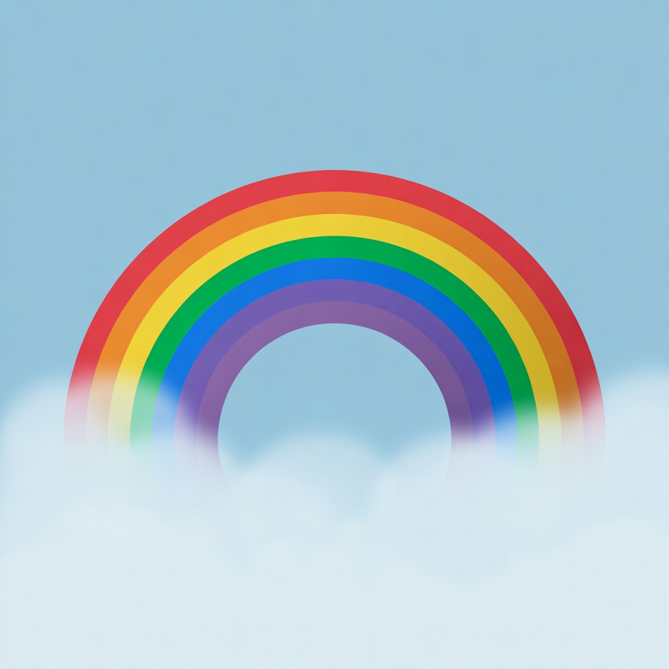 A vibrant rainbow arcs across a clear blue sky with fluffy white clouds below. The rainbow displays all seven colors from red to violet. It is illustrated in a simple, flat style on an isolated background.