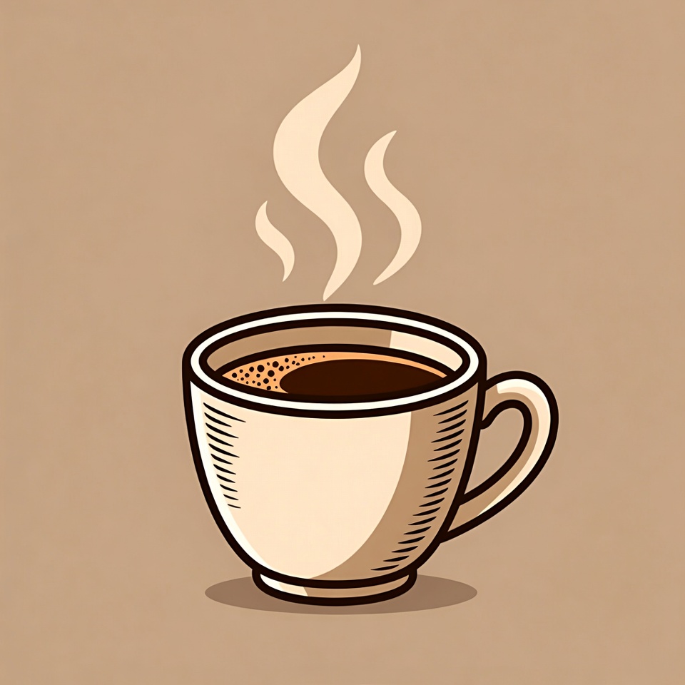 A hand-drawn illustration of a white ceramic coffee cup filled with dark coffee on a beige background. Steam rises in white swirls from the hot beverage. The cup features a simple handle and textured shading.