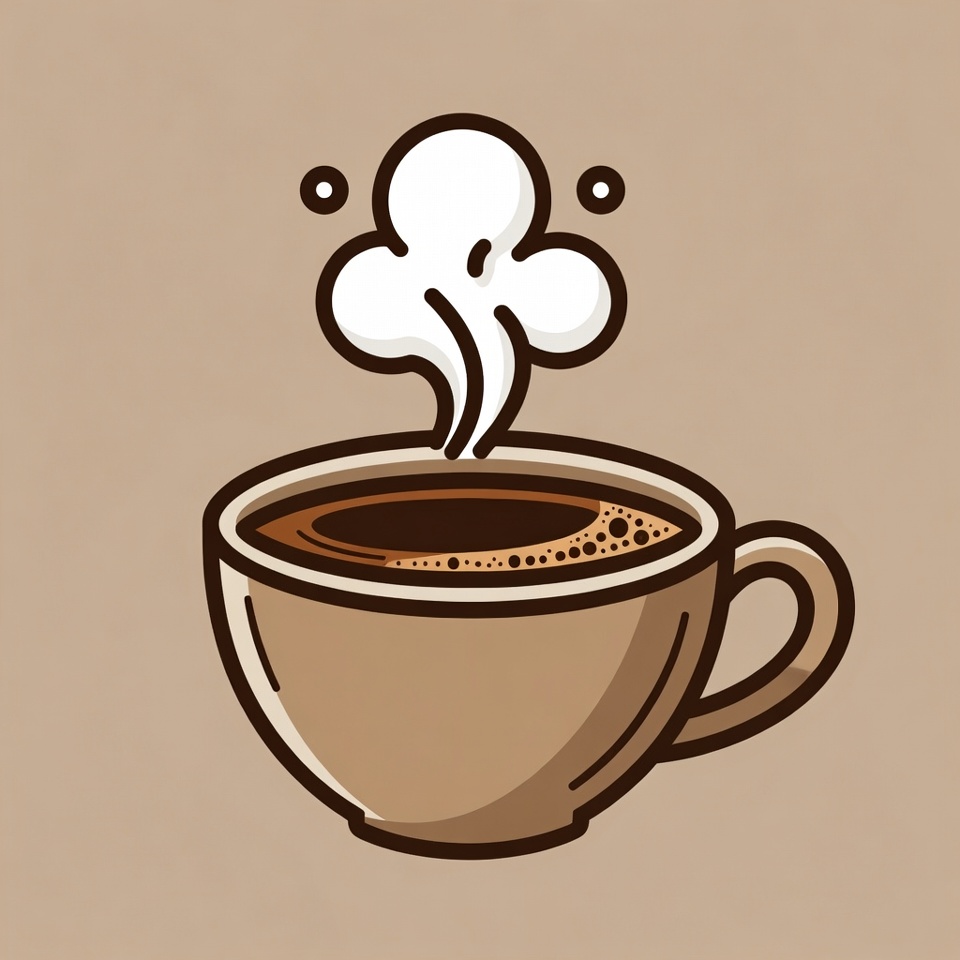 A cartoon illustration of a beige ceramic mug filled with dark coffee and foam. White steam rises in curly wisps from the hot beverage. The image features a simple line art style on a solid beige background.