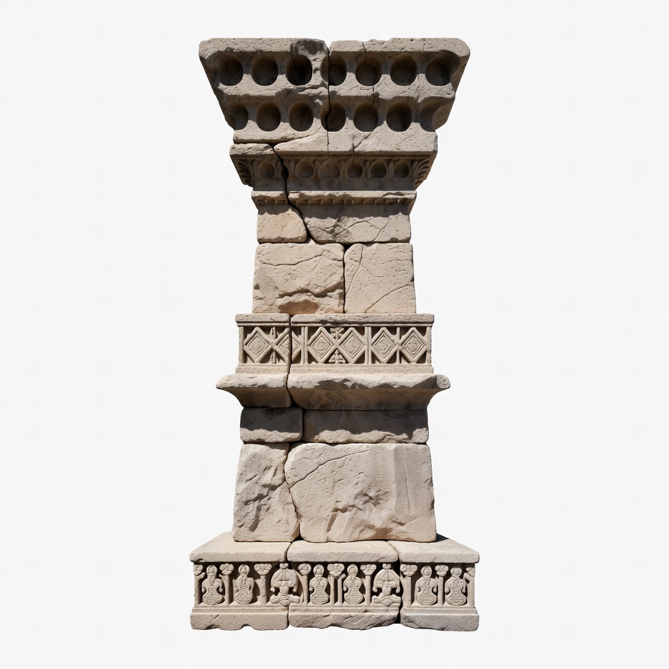 architectural element, architecture, carved stone, classical column, column base, decorative frieze, historical architecture, isolated background, ornate capital, pillar, ruins, stone column, weathered stone, white background, ancient column