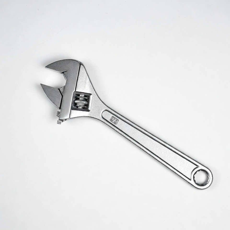 adjustable jaw, hand tool, hardware, isolated background, mechanic tool, metal tool, open jaw, plumbing tool, repair tool, shiny wrench, silver wrench, tool, white background, wrench, adjustable wrench