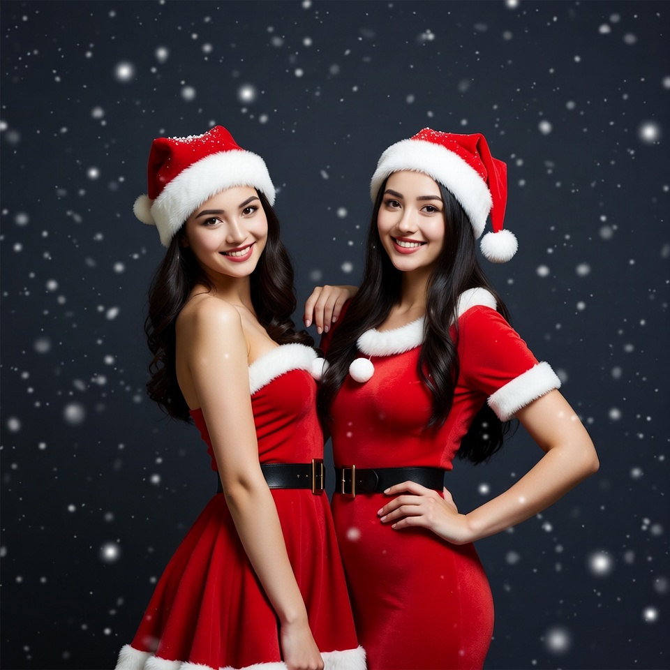 Two smiling Asian women with long dark hair wear matching red Santa dresses with white fur trim and black belts. They don red Santa hats with white pom-poms and pose playfully with hands on hips against a dark snowy background filled with falling snowflakes.