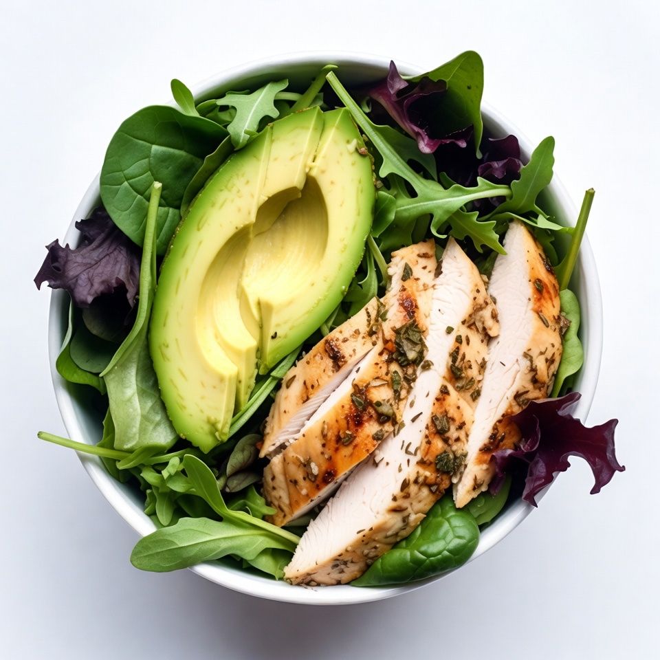 A fresh salad bowl features sliced grilled chicken breast, ripe avocado chunks, and mixed greens including green lettuce, red lettuce, and arugula. Herbs are sprinkled on the chicken, and the bowl is viewed from above on a white background. The vibrant ingredients are arranged neatly in a white bowl.