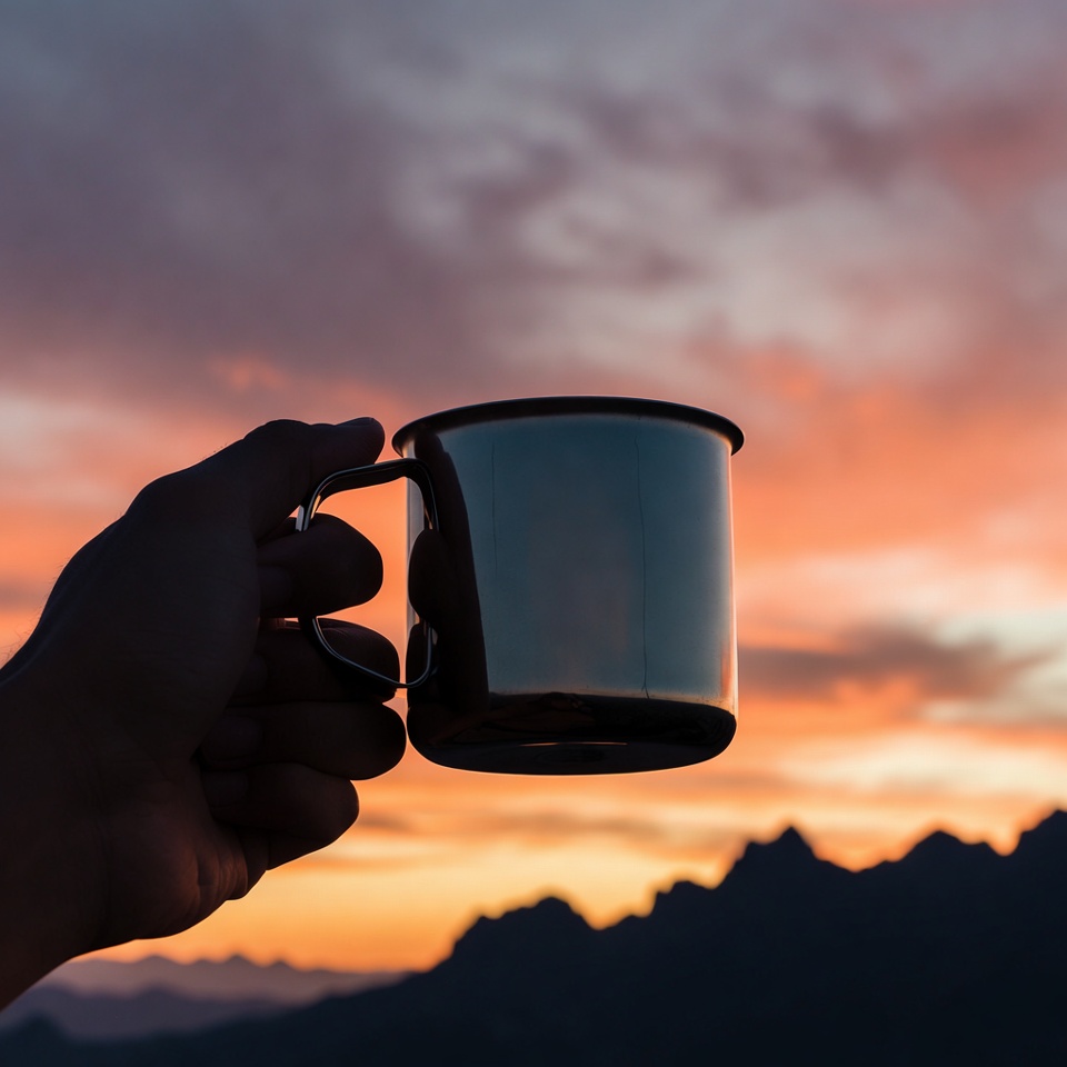 adventure, backpacking, camping mug, clouds, dusk, hiking, holding mug, landscape, metal mug, mountains, nature, orange sky, outdoors, peak, purple sky, ridge, silhouette, silver mug, sky, sunset, travel, hand
