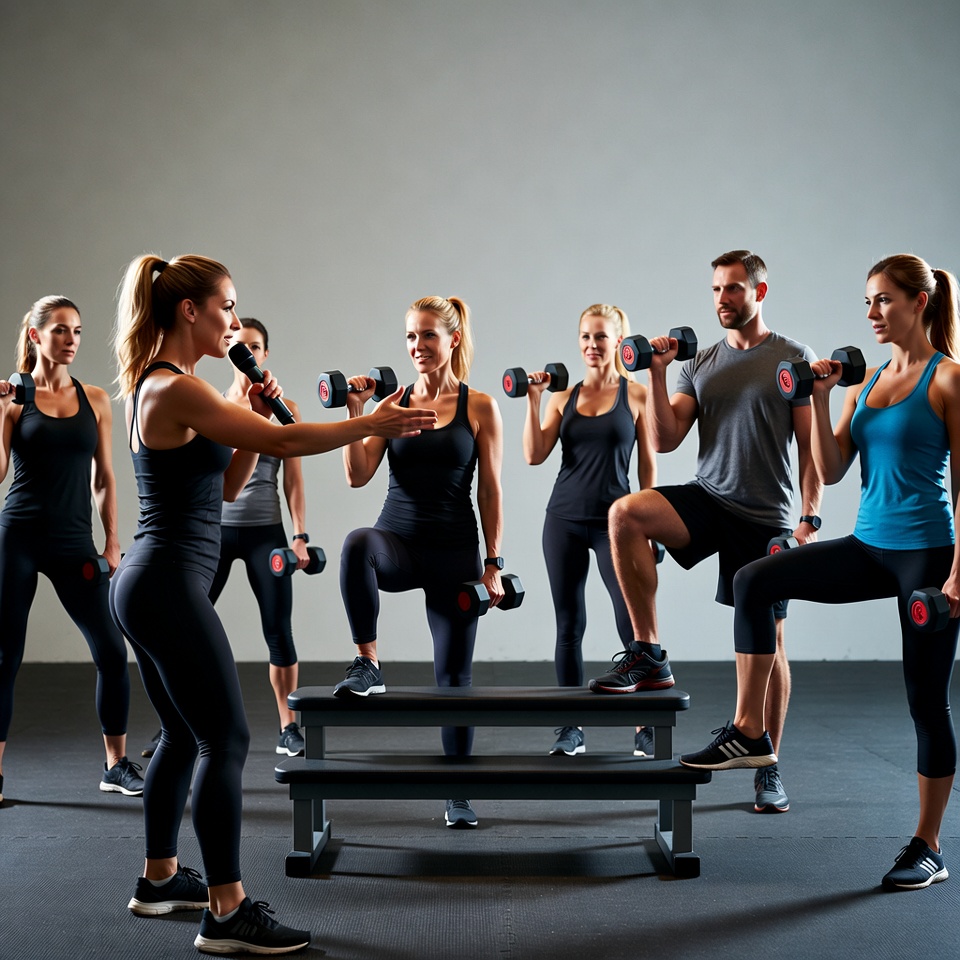 White, athletic wear, bench, dumbbell exercise, exercise class, female, fitness training, gray wall, group fitness, group workout, gym class, gym floor, indoor gym, leggings, male, man, ponytail, red dumbbells, sneakers, squats, tank tops, weight lifting, women, workout session, fitness instructor
