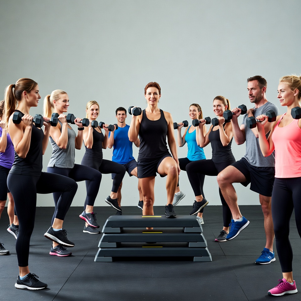 Group Fitness Class Doing Step-Ups with Dumbbells