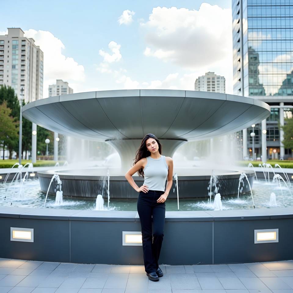 A young Asian woman with long dark hair stands confidently with hands on hips in front of a large modern fountain. She wears a light gray cropped top and black pants, surrounded by tall glass skyscrapers and water spraying from the fountain. The scene is set on a paved plaza under a partly cloudy sky.