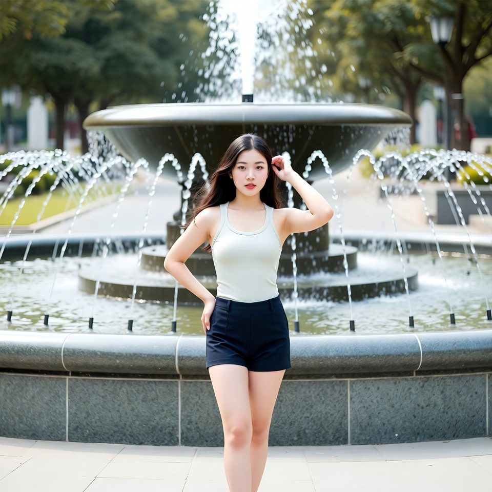 A young Asian woman with long dark hair stands in front of a large circular fountain with water spraying upward. She wears a light gray tank top and black shorts, posing with one hand on her hip and the other touching her hair. Lush green trees surround the stone fountain in an outdoor urban setting.