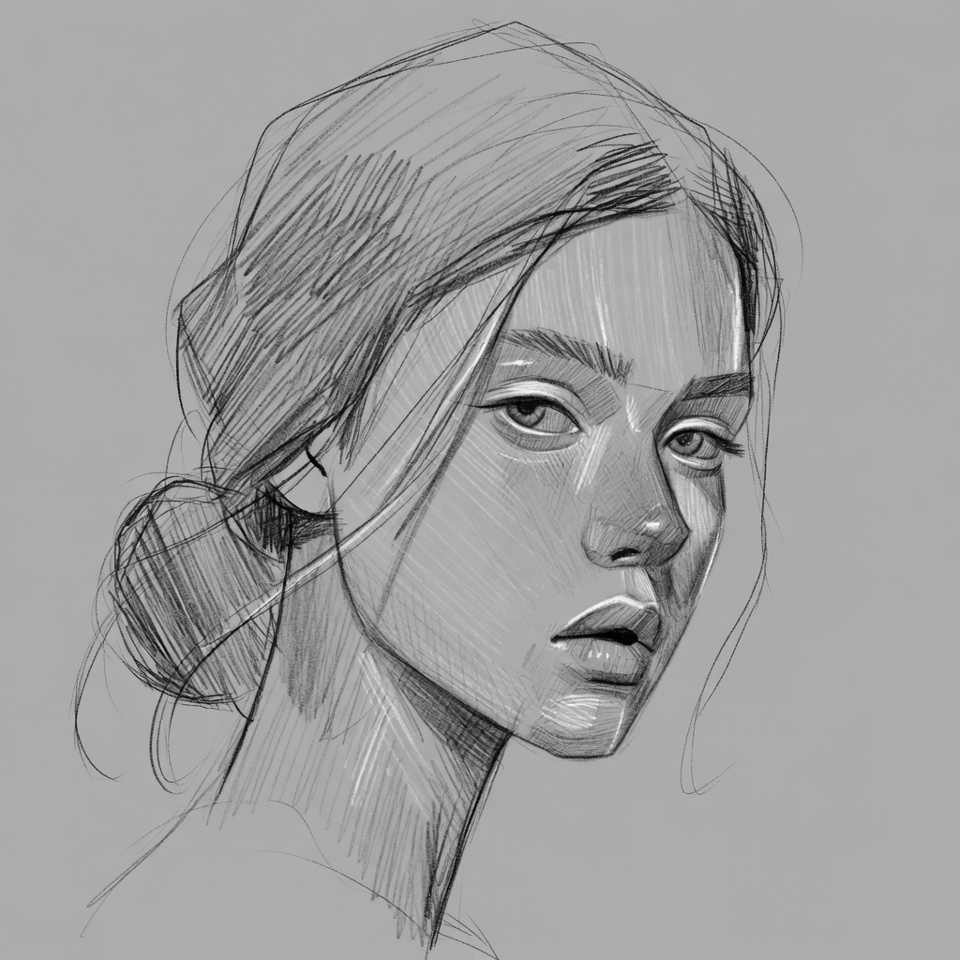 A detailed pencil sketch depicts a young woman with her hair styled in a loose bun. She gazes slightly to the side with subtle shading on her face and neck. The artwork features bold, expressive linework on a plain gray background.