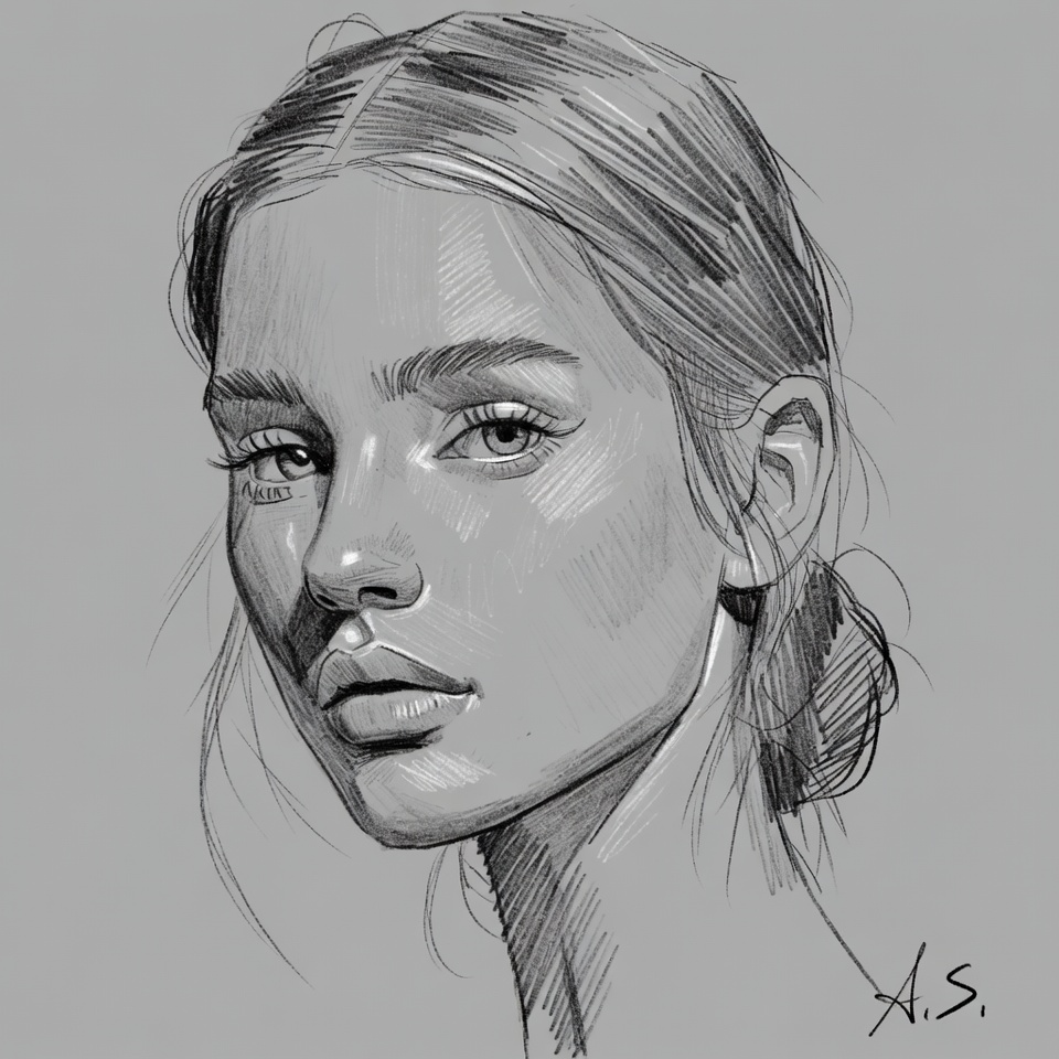 A detailed pencil sketch depicts a young woman's face with long flowing hair tied partially back. She has striking green eyes, full lips, and soft facial features highlighted by shading and cross-hatching. The artwork is signed 'A.S.' on a plain gray background.