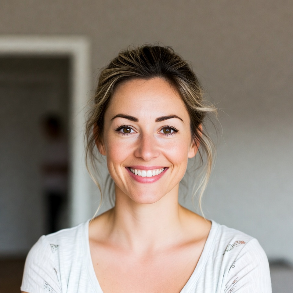 A young woman with blonde hair in a loose updo smiles warmly at the camera. She wears a light gray sleeveless top and stands in a bright indoor room with an open door in the background. A blurred man is visible in the doorway behind her.