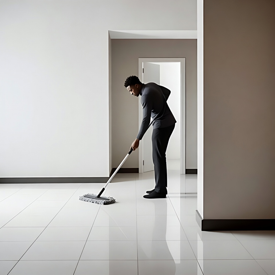 African-American, bent over, business suit, cleaning, floor cleaning, gray suit, hallway, indoor, janitor suit, male, modern interior, mop, mopping, neutral walls, office cleaning, open door, professional attire, shiny floor, white tiles, working man, man