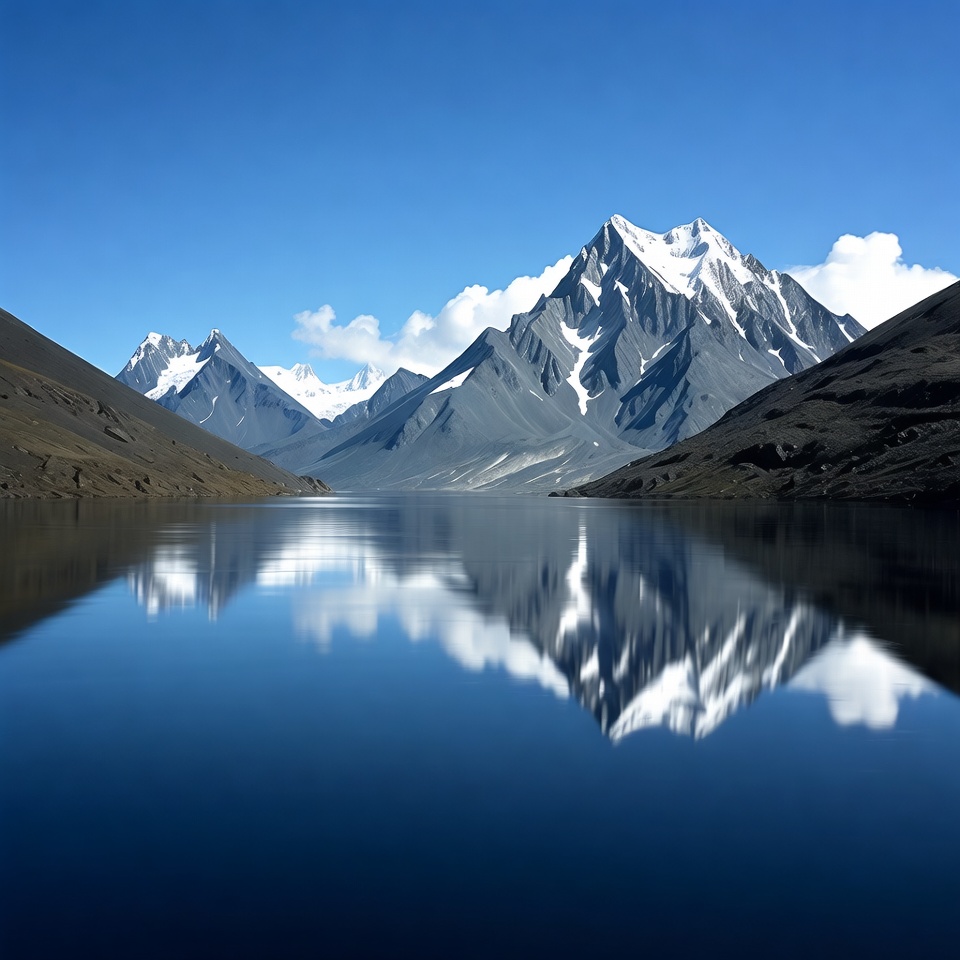 Towering snow-capped mountains rise sharply from a calm lake, their rugged peaks and slopes perfectly mirrored in the glassy blue water. Fluffy white clouds dot the clear sky and are reflected below. The scene features dramatic rocky terrain surrounding the serene water body.