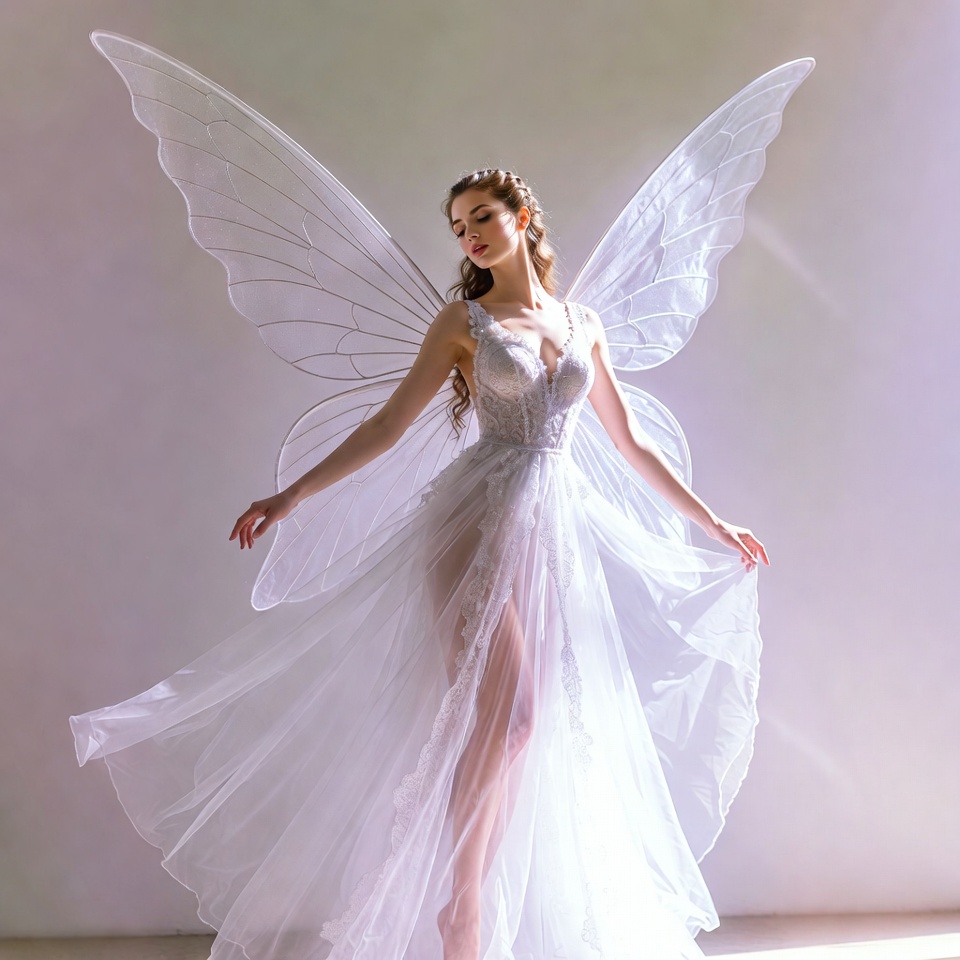 A woman with long wavy brown hair and elegant makeup poses gracefully in a flowing white lace dress with spaghetti straps. She has large translucent white fairy wings attached to her back and extends her arms while standing against a light purple gradient background. Her dress features intricate lace details and a high slit, with soft lighting highlighting her figure.
