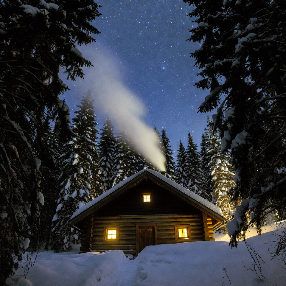 cabin windows, chimney smoke, cozy cabin, evergreen trees, fir trees, forest cabin, illuminated cabin, night sky, pine trees, smoke plume, snow forest, snow-covered roof, snowy cabin, snowy path, starry sky, warm lights, winter cabin, winter night, wooden cabin, log cabin