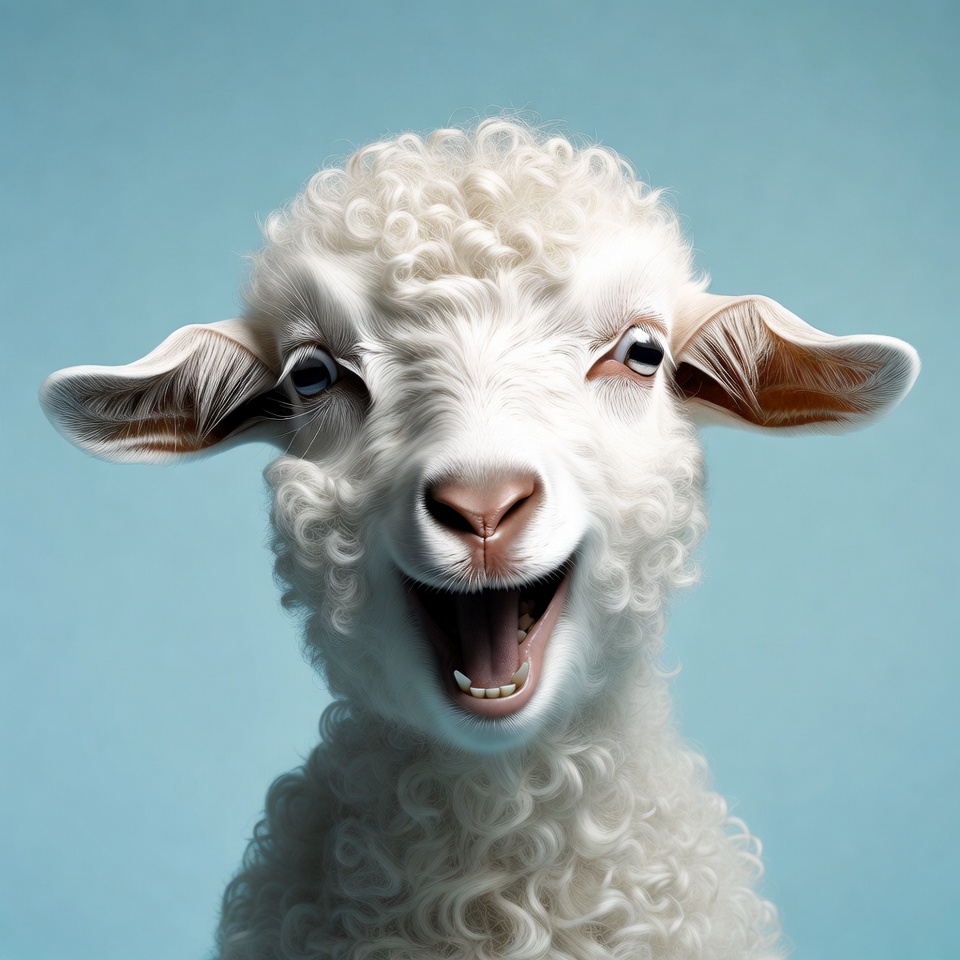 Fluffy lamb smiling on blue background