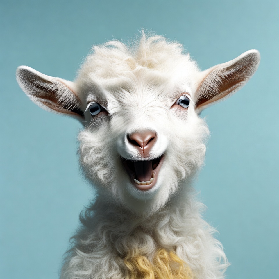 animal, blue eyes, curly fur, cute goat, farm animal, floppy ears, fluffy goat, goat, isolated background, kid goat, light blue background, smiling goat, white goat, young goat, baby goat