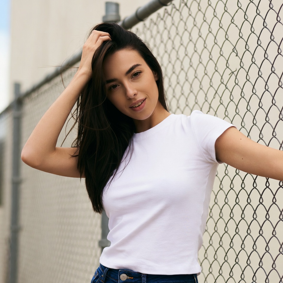 A young woman with long dark hair stands in front of a chain link fence, touching her hair with one hand. She wears a white short-sleeve t-shirt and blue jeans, smiling slightly at the camera. Her other arm is extended outward against the fence on a clear day.