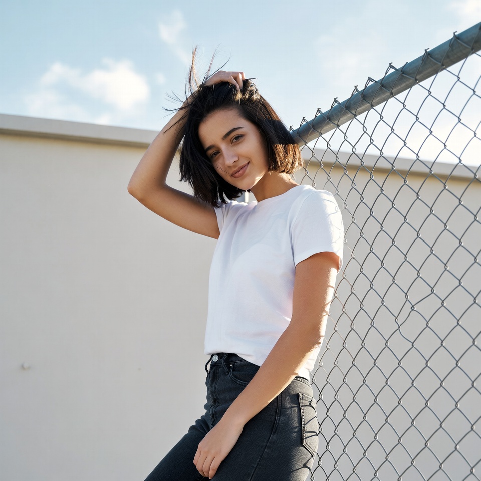 A young woman with shoulder-length dark hair stands leaning against a chain link fence under a clear blue sky with scattered clouds. She wears a white short-sleeve t-shirt and black high-waisted pants, with one hand touching her hair and a slight smile on her face. The background features a white wall and open outdoor setting.