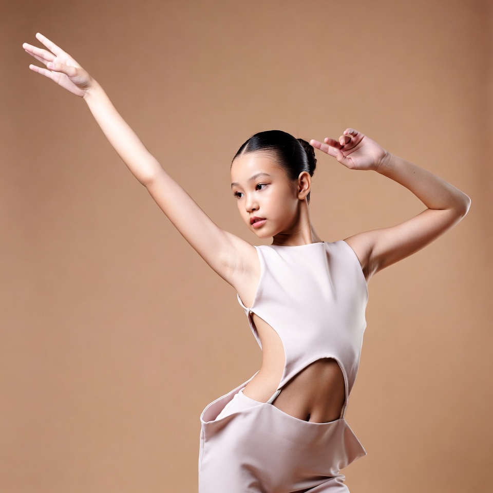 A young Asian girl with black hair in a bun performs a dynamic dance pose against a beige background. She wears a sleeveless, cut-out beige bodysuit that accentuates her slim figure and extended arms. Her hands are gracefully outstretched with fingers splayed.