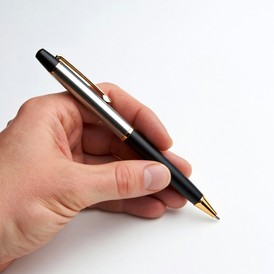 ballpoint pen, black pen, fingers, gold pen, gold tip, grip, holding pen, isolated, male, man, office supply, pen, silver barrel, white background, writing instrument, writing pen, hand