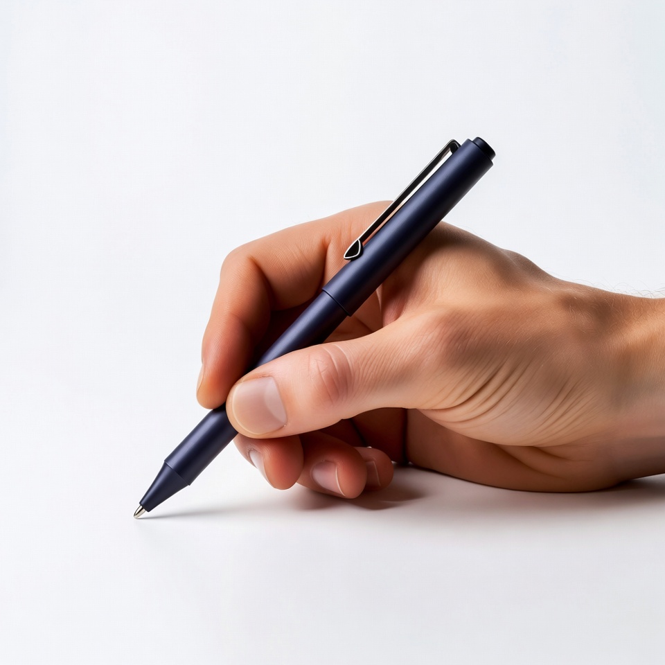 A hand holds a sleek navy blue pen and writes on a white surface. The pen has a matte finish and silver clip. The hand grips the pen firmly with visible fingers and knuckles.