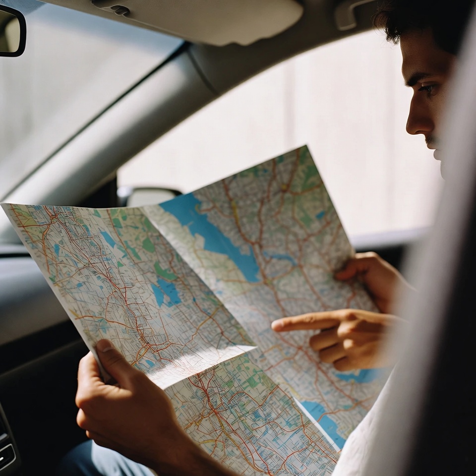 A young man with dark hair sits in the driver's seat of a car, intently studying a large folded paper map. He points at a specific location on the map with his finger while looking closely at it. The car's interior and side mirror are visible in the background.